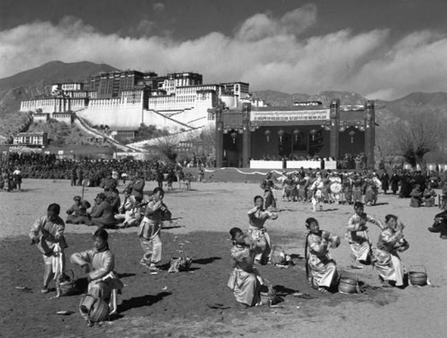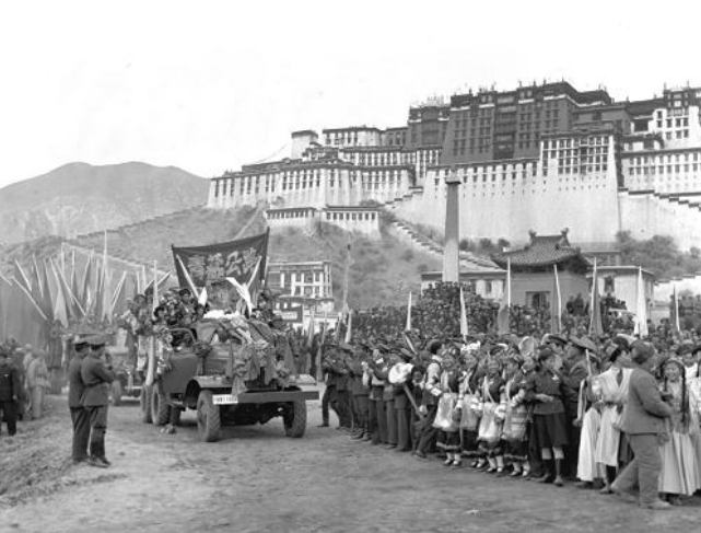 從青藏公路開到拉薩布達拉宮前的汽車隊,受到當?shù)厝嗣竦膴A道歡迎