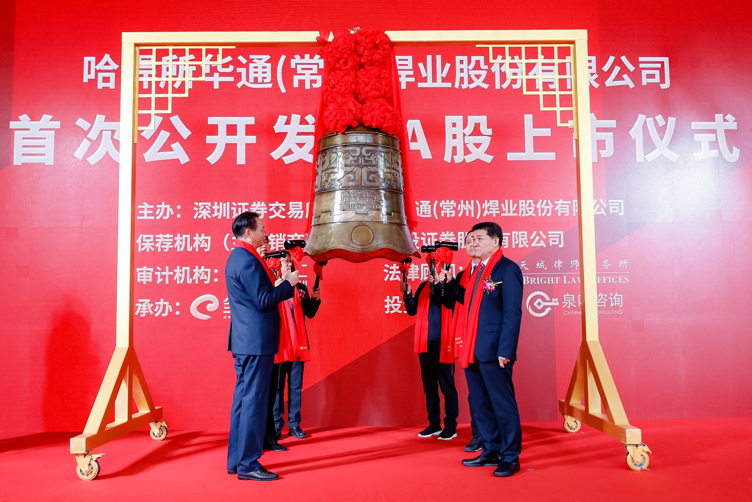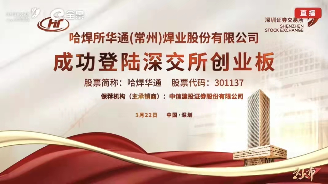 3月22日上午,哈焊所華通(常州)焊業(yè)股份有限公司(簡(jiǎn)稱(chēng):哈焊華通,股票代碼:301137)正式在深圳證券交易所創(chuàng)業(yè)板上市,上市儀式以云直播方式在常州舉行,這標(biāo)志著作為中國(guó)機(jī)械總院集團(tuán)首家IPO上市公司,哈焊華通開(kāi)始踏上資本市場(chǎng)的大舞臺(tái),步入新的發(fā)展里程。中國(guó)機(jī)械總院黨委書(shū)記、董事長(zhǎng)王德成,深圳證券交易所黨委委員、副總經(jīng)理李鳴鐘,常州市委書(shū)記陳金虎,中信建投投行董事總經(jīng)理王晨寧,哈焊華通董事長(zhǎng)楊玉亭、總經(jīng)理周全法等出席上市儀式,共同見(jiàn)證這一歷史時(shí)刻。