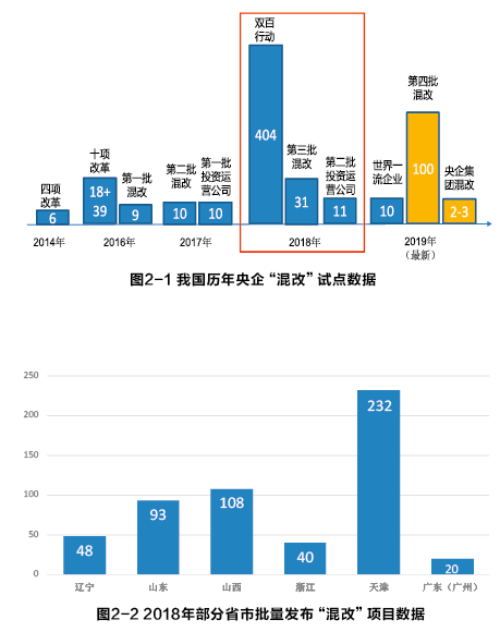 截至2018年,國(guó)家發(fā)改委推動(dòng)實(shí)施國(guó)企“混改”試點(diǎn)累計(jì)達(dá)到50家,其中僅2018年當(dāng)年就增加31家,并發(fā)布消息,2019年將進(jìn)一步推動(dòng)100家以上的“混改”試點(diǎn);國(guó)資委推動(dòng)“四項(xiàng)改革”試點(diǎn)以來(lái),時(shí)隔兩年又推動(dòng)“十項(xiàng)改革”試點(diǎn),涉及企業(yè)57家;國(guó)有資本投資運(yùn)營(yíng)兩類公司試點(diǎn)累計(jì)達(dá)到21家,其中11家為2018年底提出的;2018年,國(guó)資委推動(dòng)“雙百行動(dòng)”改革試點(diǎn),涉及國(guó)企達(dá)到404家,數(shù)量空前,標(biāo)志著國(guó)企“混改”決心不改,加量加速;2019年初始,根據(jù)權(quán)威機(jī)構(gòu)信息顯示,國(guó)資委將進(jìn)一步推動(dòng)2-3家央企集團(tuán)層面實(shí)施“混改”,預(yù)示著“混改”的力度和深度將持續(xù)加強(qiáng)。